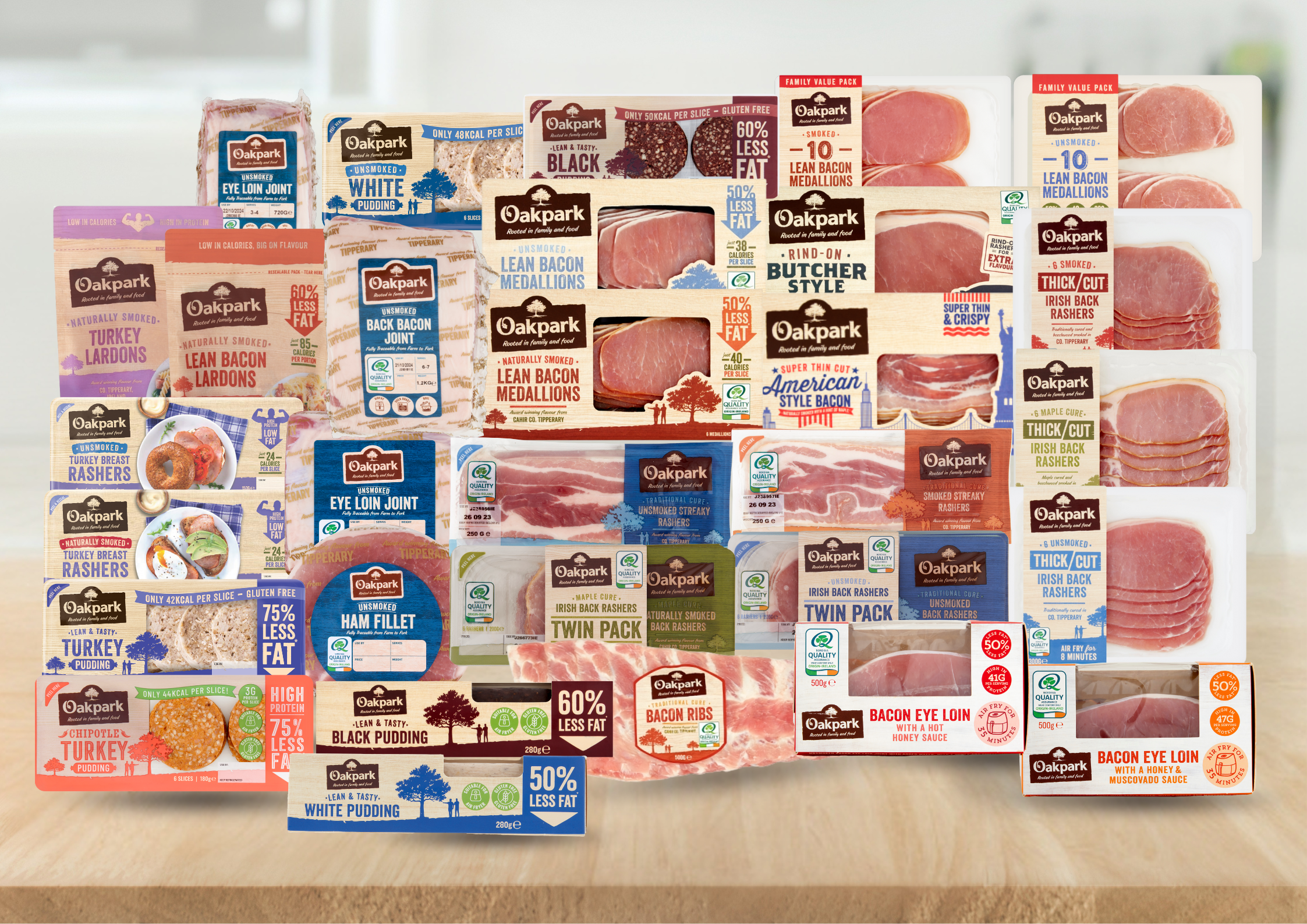 At Oakpark we pride ourselves on marrying traditional style pork and bacon with cutting edge new product design and development. We offer pork and bacon products which are tasty, wholesome and traceable back to the farm. Home cured bacon has been the staple meat of Irish and British families for generations. Oakpark has preserved the old recipes and the traditional curing craft to ensure that our bacon tastes like bacon used to. We have used our old family bacon curing methods to bring tasty new products to you, see just some of them below. Available across Ireland and the UK, ask in your local store for details.